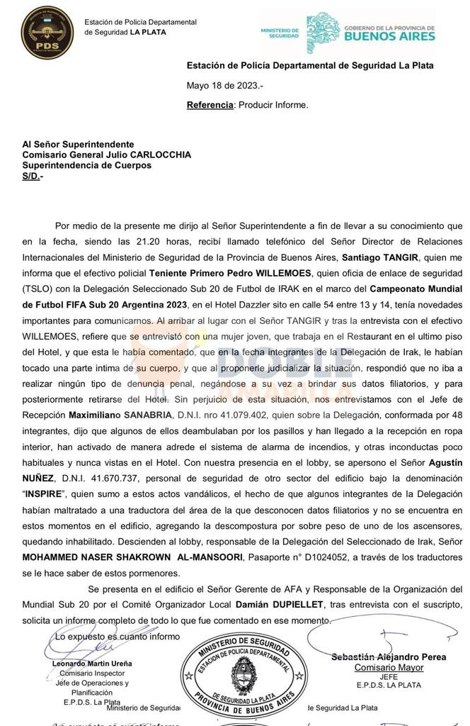 El enlace de seguridad con el Seleccionado Sub20 de Irak, el teniente primero Pedro Willemoes, notificó los hechos y convocó a sus superiores al hotel Dazzlerde de La Plata (60 km al sur de Buenos Aires), donde se aloja el equipo del país del Medio Oriente.