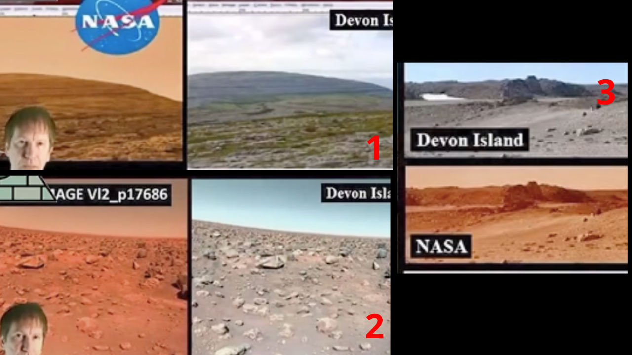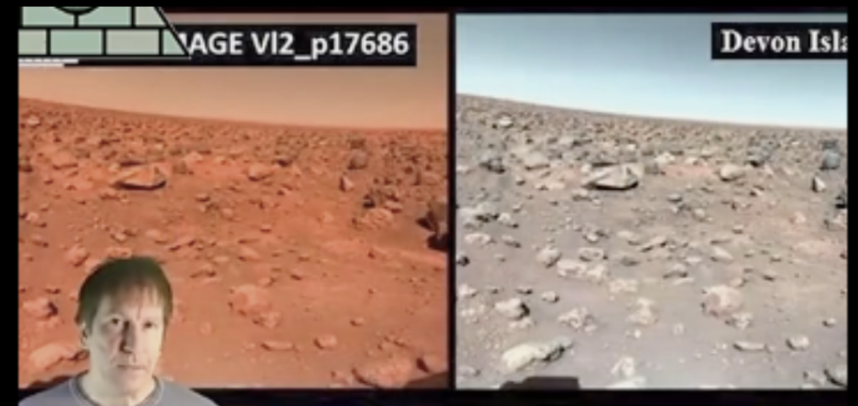 “Podemos ver lo que sucede cuando comparamos las imágenes del suelo marciano con regiones de la tierra como Devon Island. Mismas tomas, mismos relieve en las tomas, mismo tipo de formación rocosa del terreno”, señala el hombre en el video viral.