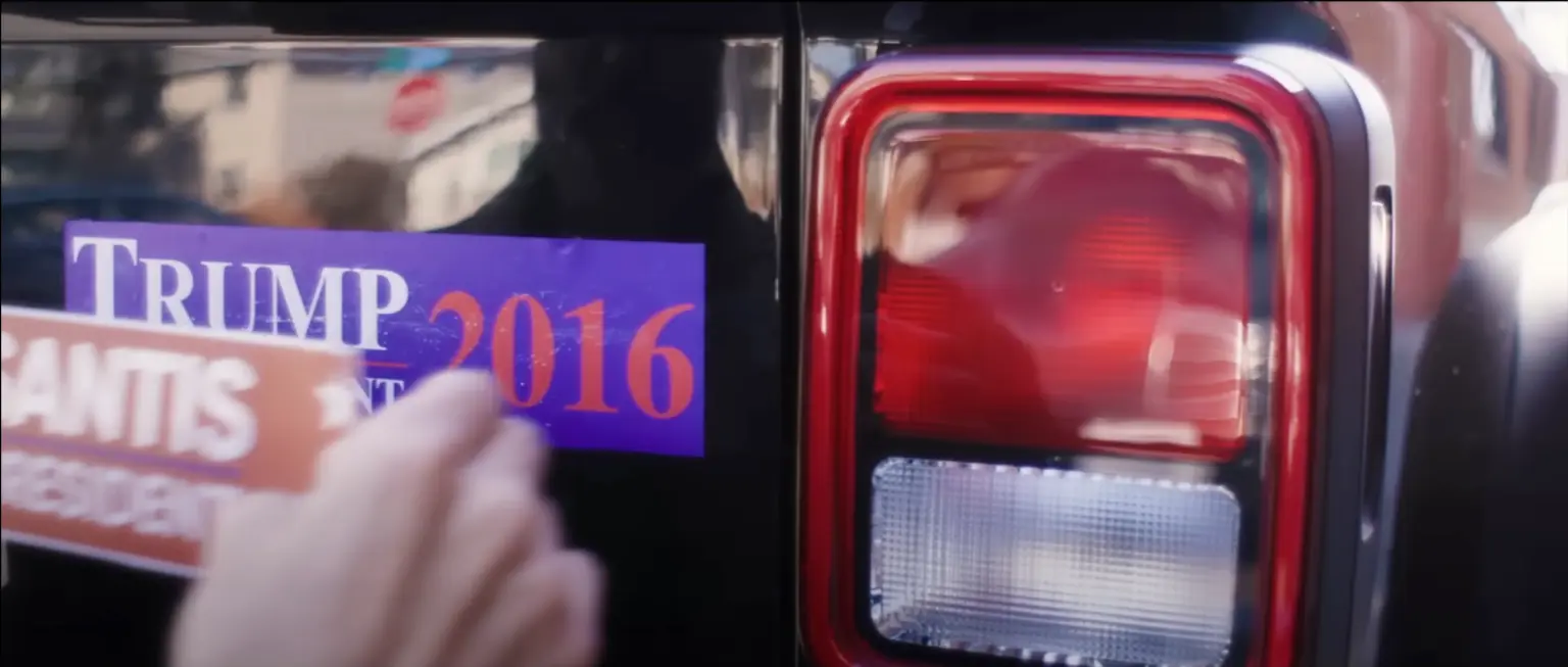 En un video reciente del comité de acción política del gobernador, un hombre pone una pegatina "DeSantis presidente" en la carrocería de un auto, por encima de una con el lema "Trump 2016".