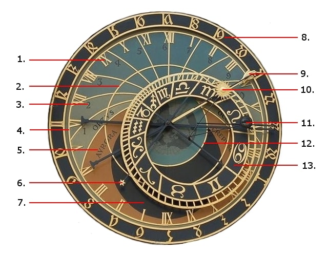El cuadrante muestra las 24 horas del día usando diferentes tipos de números: góticos para la hora checa antigua (desde que se pone el sol), arábigos para la hora estándar (1, 2, 3, etc.) y romanos para las horas siderales (el día real de 23 horas y 56 minutos). También muestra las fases de la luna, la posición del sol y la luna en el zodíaco, el solsticio y el equinoccio, y otros detalles astronómicos. El calendario circular tiene medallones que representan los meses del año, pintados por el artista checo Josef Mánes en el siglo XIX.