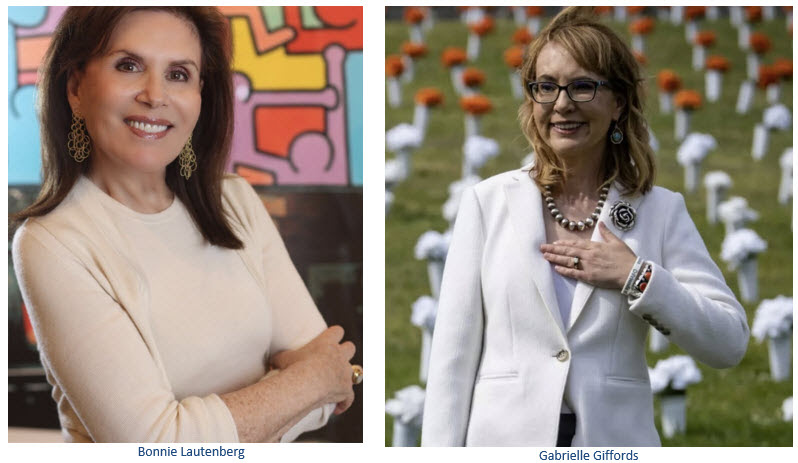 Los estadounidenses están exigiendo un futuro más seguro, y si nos unimos podemos crear un futuro libre de violencia armada. Así lo afirma la ex congresista Gabby Giffords, fundadora de la organización Giffords.org, que se dedica a prevenir el problema de las armas en Estados Unidos. "Este mensaje vital está llegando a más personas en todo el país, gracias a la poderosa obra de arte de Bonnie Lautenberg: Armas matan".