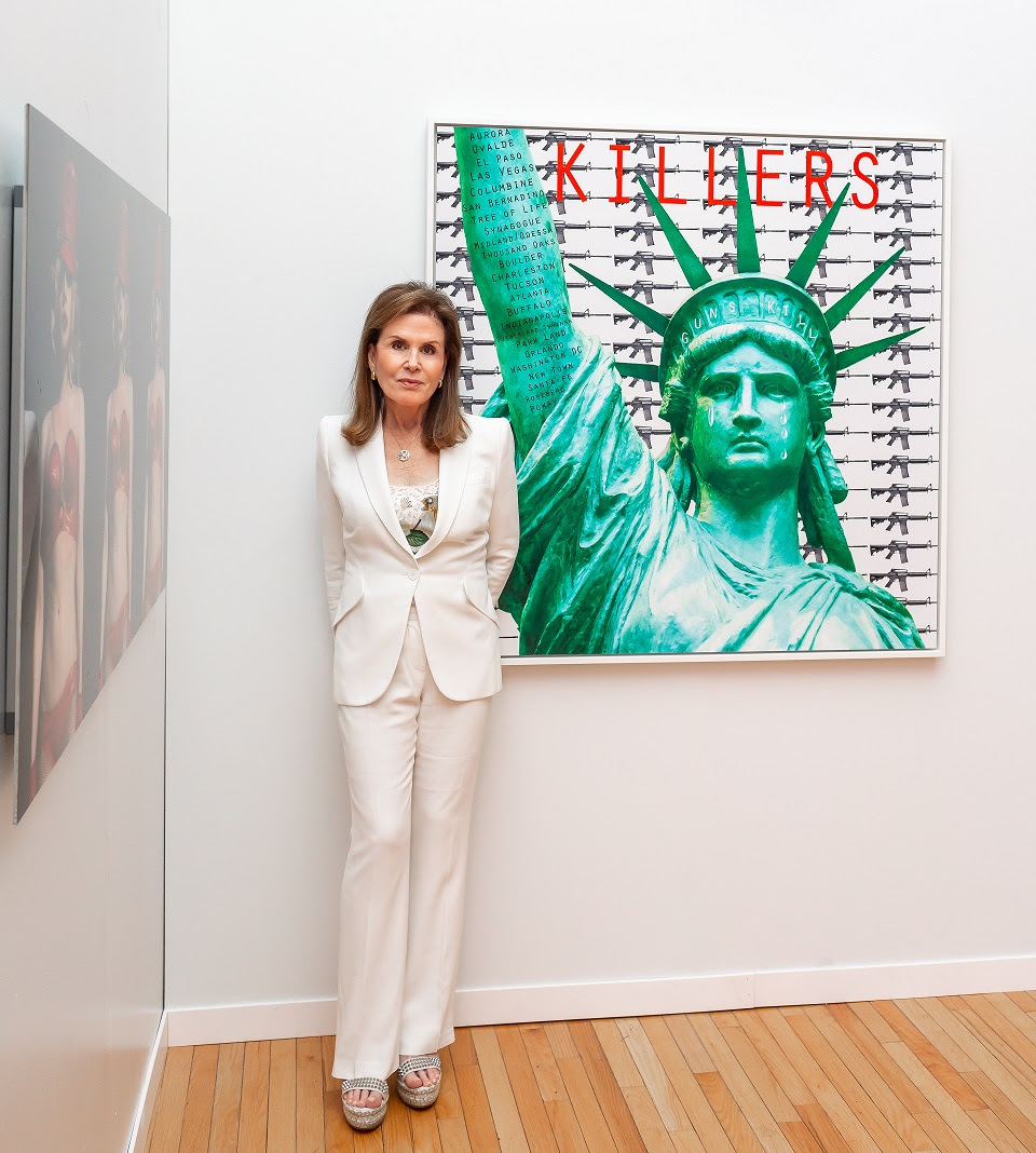 "Creé esta obra de arte especialmente para Gabby Giffords", dice la artista Bonnie Lautenberg. "Añadí lágrimas que caen por la cara de la Estatua de la Libertad, las dos simples palabras 'Armas matan' en su corona, y lugares de masacres en el brazo de Lady Liberty. Me entristece profundamente que la lista de masacres siga creciendo con tantos lugares donde los estadounidenses siguen perdiendo a sus seres queridos por la violencia armada", añade Lautenberg.