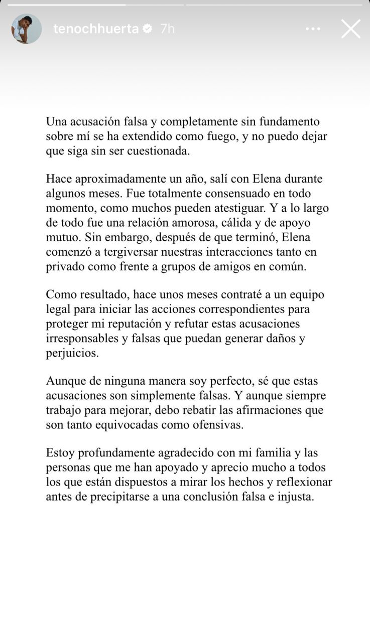 Tenoch Huerta negó las acusaciones el lunes. Publicó comunicados en español e inglés en su Instagram. El actor dijo que salió con Ríos durante varios meses el año pasado. Aseguró que todo fue consensuado.
