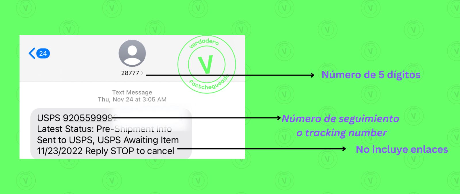 2 - Los mensajes de USPS no contienen enlaces. Así que si te llega un mensaje no solicitado supuestamente de USPS en el que te pidan que le des clic a un link: no lo hagas.