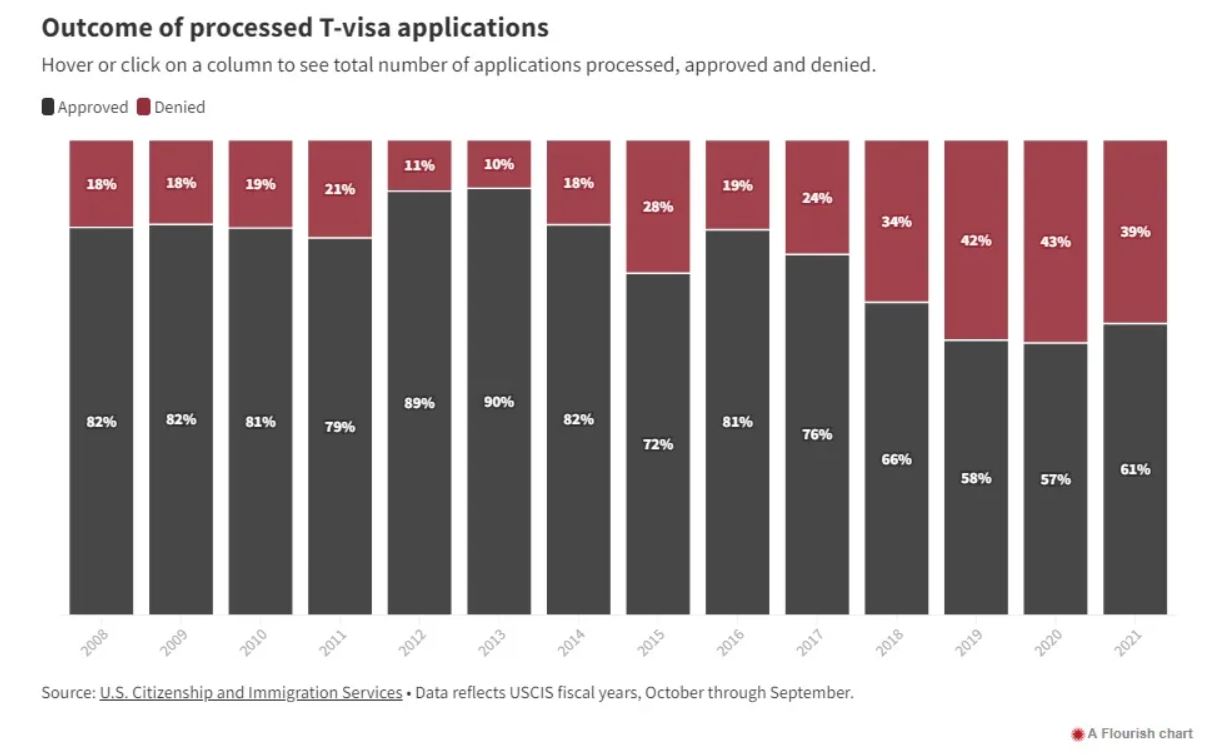 Y los defensores de los inmigrantes afirman que la tramitación de las solicitudes de T-visa puede llevar demasiado tiempo, que se deniegan demasiadas solicitudes y que no se sabe quién puede optar a ellas. Aunque el gobierno federal autoriza hasta 5 mil visados T al año, sólo se expide una pequeña parte de ese número: una media de poco más de 600 al año entre 2008 y 2022, según datos federales.