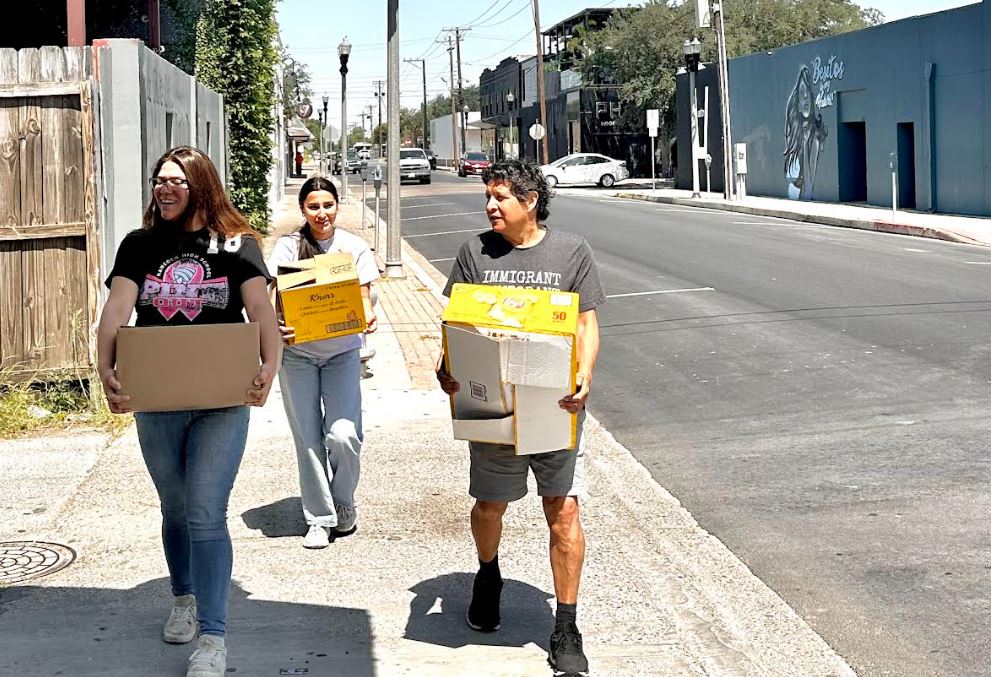 Dos voluntarias de Caridades Católicas junto a Tijerino en downtown McAllen, Texas, con cajas llenas de Conchas (panes dulces) para llevar al centro de inmigrantes.