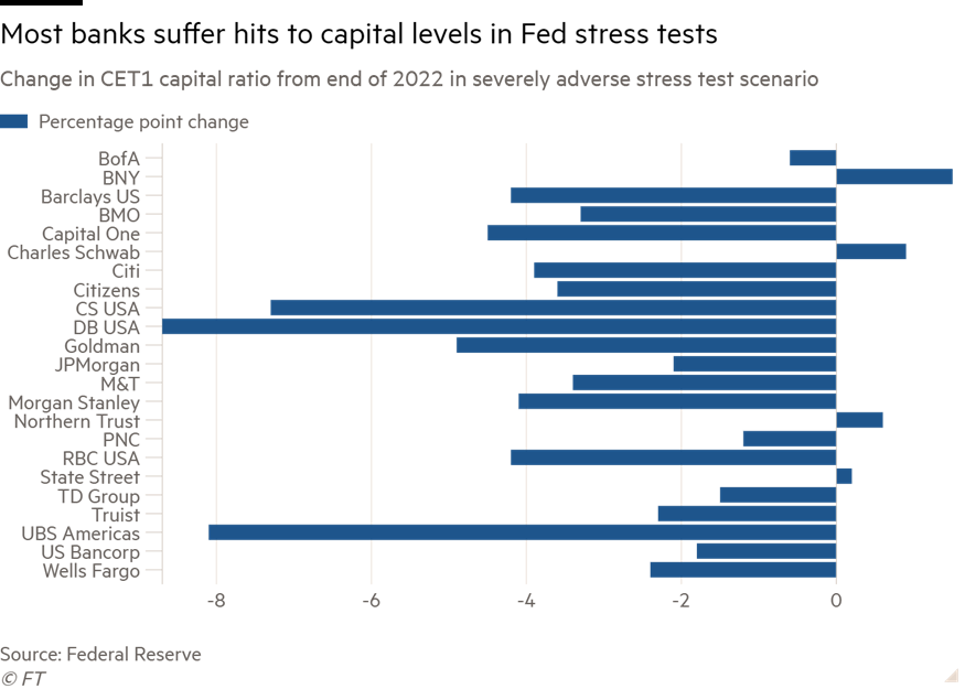 Las pruebas demostraron que todos los bancos examinados, incluyendo Bank of America, Citigroup, State Street y Wells Fargo, cumplirían con los requisitos mínimos de capital a pesar de las pérdidas proyectadas de $541 mil millones. De las pérdidas, $424 mil millones provienen de pérdidas por préstamos y $94 mil millones por pérdidas de negociación y contraparte.