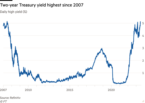 El rendimiento del bono del Tesoro a dos años alcanza su nivel más alto desde 2007 ante las expectativas de nuevas subidas de tasas de la Fed.
