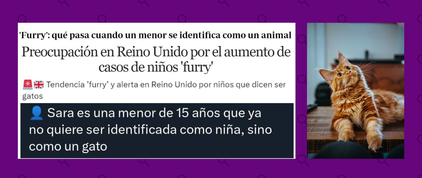 "Sara es una menor de 15 años que ya no quiere ser identificada como niña, sino como un gato", reportó un medio español sobre una niña británica que supuestamente ha pedido ser identificada como un gato. Otros contenidos hablan de un aumento de casos de “niños ‘furry’”, que tienen afinidad por animales fanatasiosos con formas humanas. Algunos contenidos comparan a las personas ‘furries’ con las transexuales y utilizan algunas narrativas para desinformar sobre ambos colectivos, como que existe una relación entre ellos y los casos de pedofilia o que se trata de una discapacidad o una patología. Algo que no es cierto.