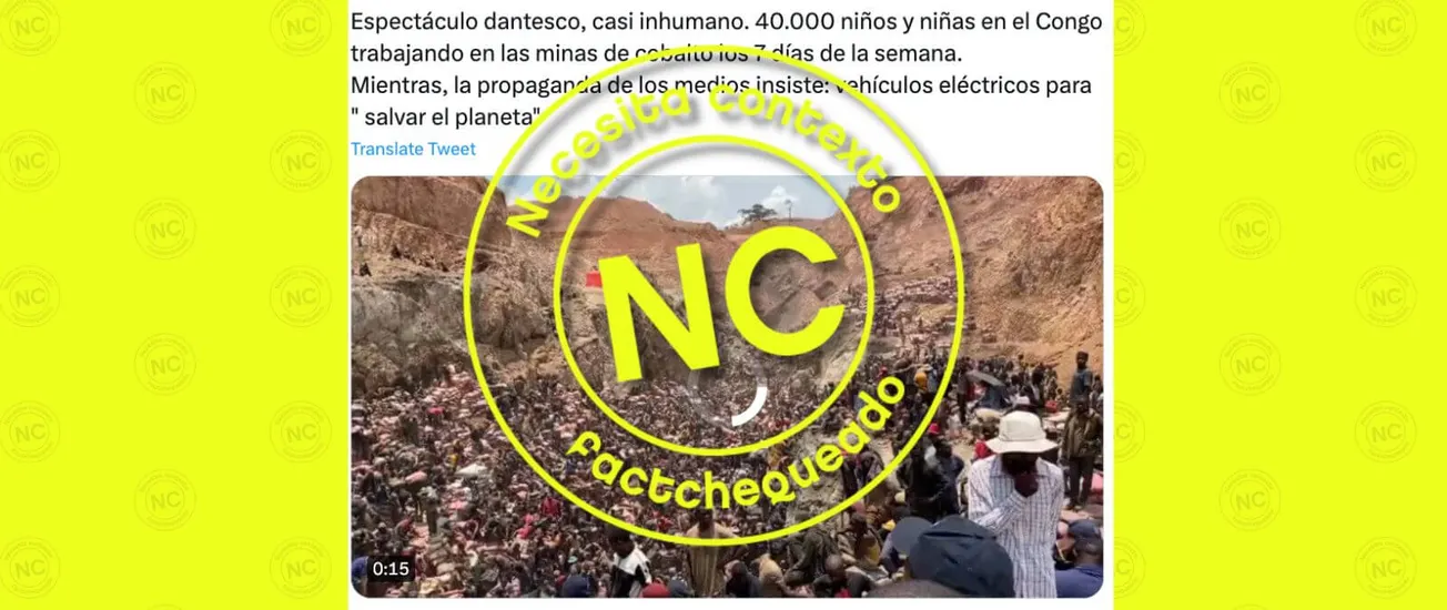 Desde el 15 de julio de 2023 circula una publicación en Twitter que muestra el video de una mina de cobalto en el Congo, acompañado por un texto que dice “espectáculo dantesco, casi inhumano. 40,000 niños y niñas en el Congo trabajando en las minas de cobalto los 7 días de la semana. Mientras, la propaganda de los medios insiste: vehículos eléctricos para ‘salvar el planeta’". El post había alcanzado 2.2 millones de reproducciones, 22,600 ‘me gusta’, y 16,500 retweets hasta el cierre de esta nota.
