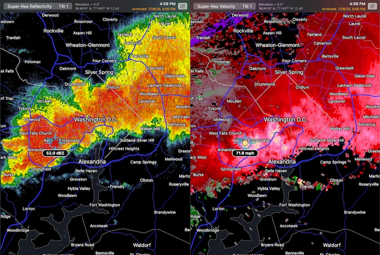 Las ráfagas descendentes son la fuente más frecuente de vientos violentos en las tormentas de la zona de Washington D.C. y pueden provocar daños más severos que algunos tornados y derechos. Los derechos son complejos de tormentas de larga duración y gran extensión que suelen abarcar varios estados.