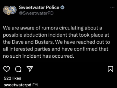 El Departamento de Policía de Sweetwater publicó el 26 de julio de 2023 en su cuenta de Instagram y Twitter un texto que niega lo ocurrido: “Sabemos de los rumores que circulan acerca de un posible rapto que tuvo lugar en Dave and Busters (sic). Hemos contactado a las partes interesadas y hemos confirmado que dicho incidente no ocurrió”.