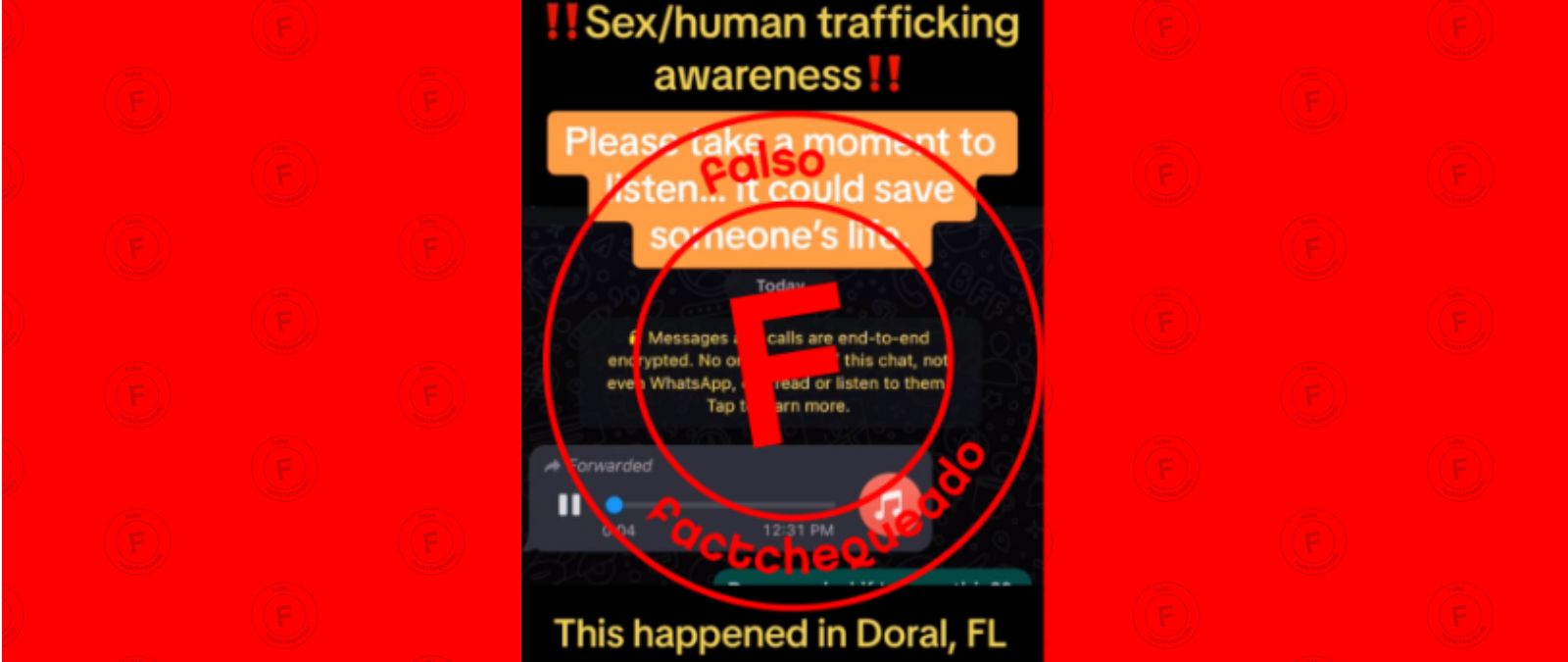 • Circula un audio por WhatsApp que describe el supuesto intento de secuestro de una niña con propósitos de tráfico sexual en el baño de un mall de Miami. La policía le confirmó a Factchequeado que esta afirmación es falsa.