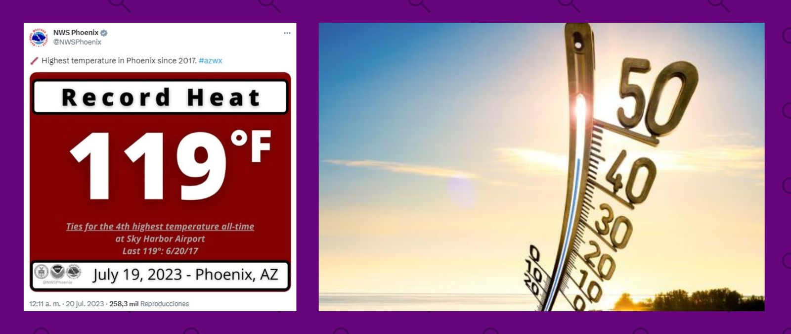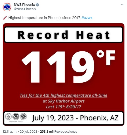 Por otro lado, Phoenix alcanzó el 19 de julio de 2023 los 119 grados Fahrenheit-48.3 grados Celsius-. Se trata de la temperatura más alta detectada en la ciudad y no se registraba desde 2017, según el Servicio Nacional de Meteorología.