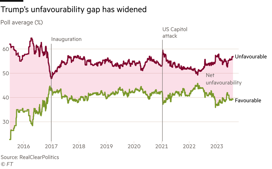 Muchos temen una contienda excepcionalmente volatil, así como una que será extremadamente reñida. Según los últimos promedios de encuestas reunidos por Realclearpolitics.com, Trump tiene una gran ventaja sobre el gobernador de Florida, Ron DeSantis, en la batalla por la nominación republicana, y solo sigue a Biden de cerca en un enfrentamiento directo.