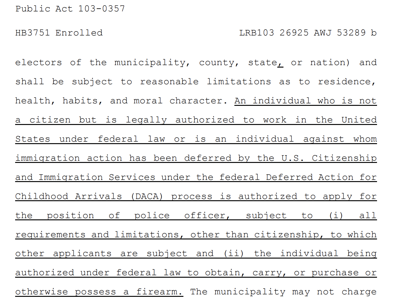 El gobernador de Illinois, Jay Robert “J.B.” Pritzker (Partido Demócrata), promulgó el 28 de julio de 2023 un proyecto de ley (titulado H.B. 3751) que permite a las agencias policiales del estado contratar a ciertos extranjeros que estén legalmente en el país y que tengan permiso federal de porte de armas. La ley, que entrará en vigencia a partir del 1 de enero de 2024, no autoriza la contratación de inmigrantes indocumentados.
