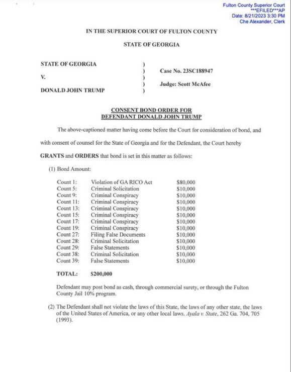 El juez del Tribunal Superior del condado de Fulton, Scott McAfee, fijó la fianza de Trump por el cargo de asociación ilícita en 80 mil dólares, mientras que los otros 12 cargos recibieron cada uno montos de fianza de 10 mil dólares, según el documento judicial.