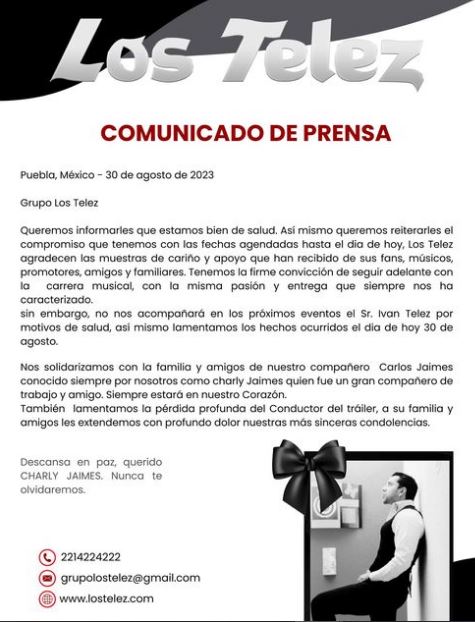 "Tenemos la firme convicción de seguir adelante con la carrera musical con la misma pasión y entrega que siempre nos ha caracterizado; sin embargo, no nos acompañará en los próximos eventos el señor Iván Telez por motivos de salud".