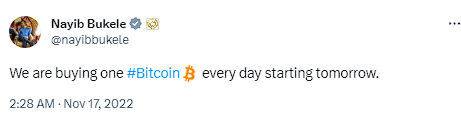 El gobierno salvadoreño ha dicho públicamente que ha comprado 2.381 bitcoins, sin revelar las cifras de lo invertido. La última compra fue efectuada el 30 de junio de 2022 cuando adquirió 80 bitcoins. El 17 de noviembre de 2022 Bukele anunció que El Salvador compraría una unidad a diario, aunque el gobierno no ha confirmado si eso ocurrió o no.