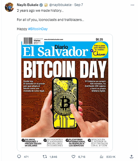 El 7 de septiembre de 2021 el bitcoin comenzó a circular legalmente en el país a instancias del mandatario. Bukele procuraba que las remesas desde el exterior fluyeran a menor costo, y que los salvadoreños, 70% de los cuales estaban al margen del sistema financiero, se bancarizaran masivamente.