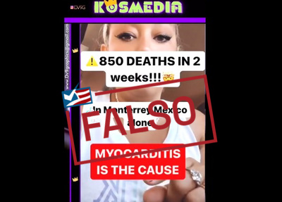 Un ejemplo reciente es un video ampliamente compartido donde una mujer afirma falsamente que en Monterrey, la capital de Nuevo León, estado ubicado en el noreste de México, 850 personas murieron por miocarditis en un lapso de dos semanas. La mujer no vincula directamente las muertes con la vacunación contra el COVID-19, pero dice, en inglés, que los doctores “están haciéndolo público” porque el gobierno y los medios “mienten” al decir que las muertes fueron causadas por una ola de calor y “porque la gente ya despertó y no van a dejarse empujar como lo hicieron durante la pandemia”.