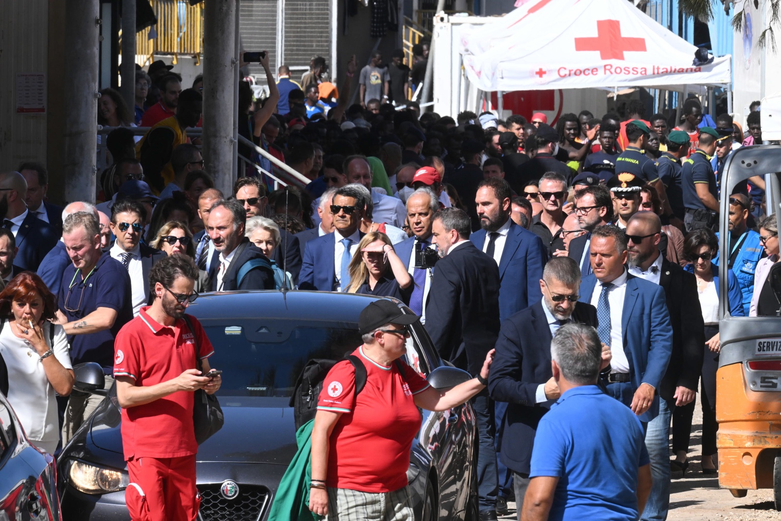 Acompañada por Giorgia Meloni, primera ministra italiana, Von der Leyen visitó el centro de acogida de inmigrantes de Lampedusa que actualmente recibe una oleada de miles de personas.