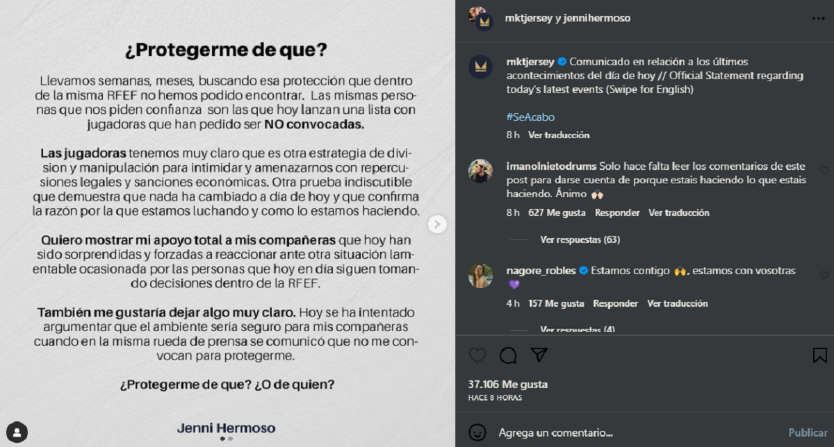 "Llevamos semanas, meses buscando esa protección que dentro de la Real Federación Española de Fútbol (RFEF) no hemos podido encontrar. Las mismas personas que nos piden confianza son las que hoy lanzan una lista con jugadoras que han pedido ser no convocadas", reza el comunicado publicado el 18 de septiembre, en referencia a la lista de Tomé.