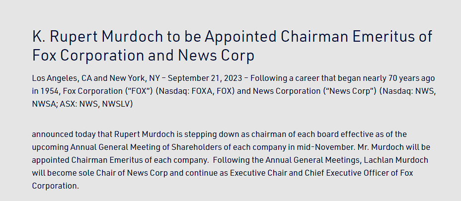 Ahora el ascenso definitivo de Lachlan Murdoch a la cúspide del conglomerado mediático mundial marca el comienzo de un nuevo capítulo.