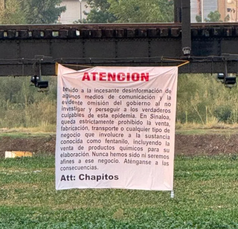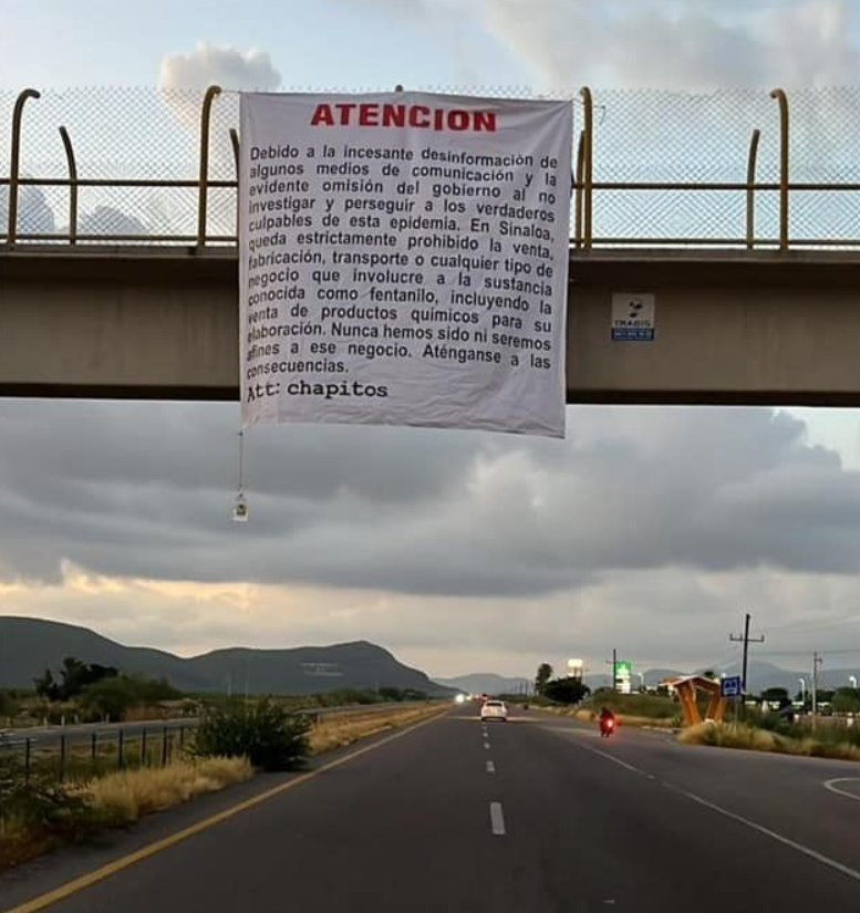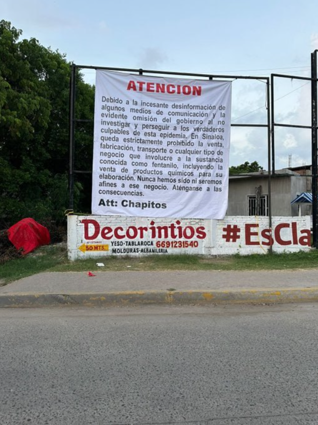 "En Sinaloa está estrictamente prohibida la venta, fabricación, transporte o cualquier otro negocio relacionado con el fentanilo, incluida la venta de los químicos utilizados para producirlo. Están advertidos. Respetuosamente, Los Chapitos", se lee en las pancartas.