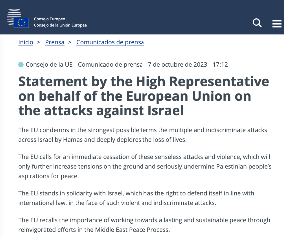Por su parte, la Unión Europea, a través del Consejo Europeo, emitió una nota de prensa en la que condenaba “los múltiples e indiscriminados ataques a lo largo de Israel por parte de Hamás”.