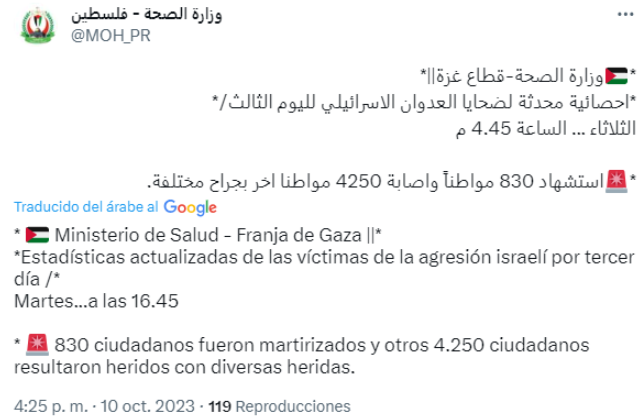 Por parte de Palestina, el Ministerio de Salud de la Franja de Gaza está actualizando en sus redes sociales las cifras de muertos y de heridos.
