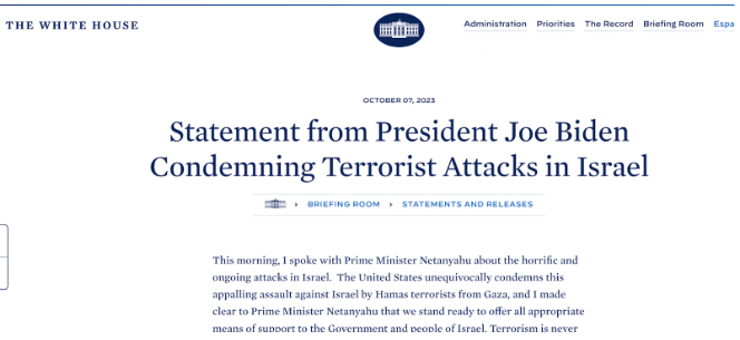 Además, la Casa Blanca emitió un comunicado el 7 de octubre de 2023 para condenar el ataque de “terroristas de Hamas en Gaza” y ofreció su apoyo a Israel.