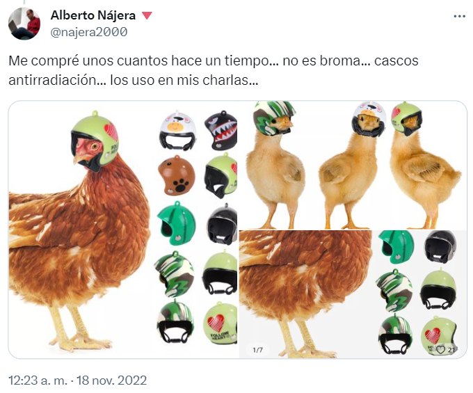 “Yo pensaba que era de broma, pero si buscáis ‘cascos antirradiación para gallinas’, lo encontráis”. ¿Qué es realmente? Un pequeño casquito de plástico, con pintura de efecto metálico, con una pequeña cinta, que se puede colocar en cabezas de gallina (o en todo lo que tenga el mismo tamaño). “Pero aunque fuera metálico o un apantallamiento perfecto, aparte de innecesario [frente a la radiación], es absurdo”.