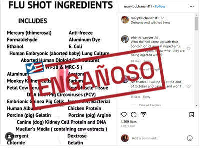 Una versión anterior del meme, que circuló y fue verificado por otros en 2020, dice que la vacuna contra la gripe incluye “algunos de estos” ingredientes. Las palabras “algunos de estos” fueron eliminadas en esta versión. La imagen no provee una fuente para la información.
