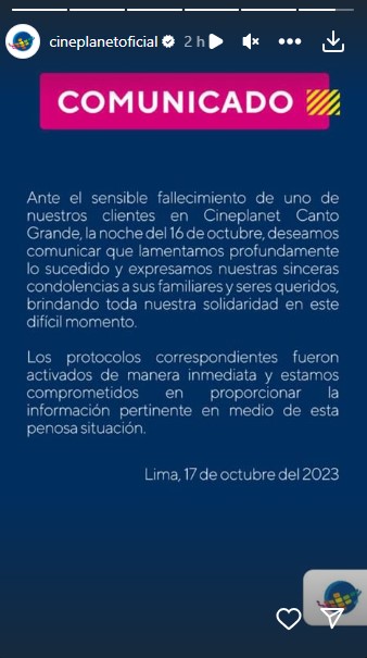 Por su parte, la cadena de cine indicó lamentó lo ocurrido y expresó sus condolencias a los familiares que se apersonaron al lugar. Precisaron que activaron los protocolos correspondientes de manera inmediata. Y que están comprometidos a proporcionar la información pertinente en medio de la situación.