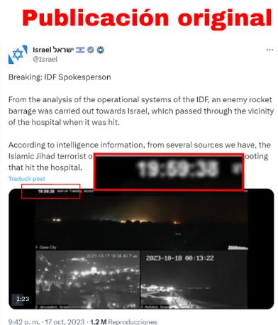 La cuenta oficial de Israel en Twitter (ahora X) editó una de sus publicaciones al borrar el video de supuestos misiles saliendo de Gaza y asegurando que uno de ellos podría haber impactado en un hospital de Gaza el 17 de octubre. Sin embargo, el ataque fue reportado a las 19:50 hora local, mientras que en la grabación de los videos aparece que son las 19:59.
