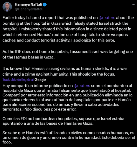 En un tuit posterior, publicado a las 5:58 pm (hora este de los Estados Unidos), reconoció que compartió “por error un informe de Reuters que afirmaba falsamente que Israel atacó el hospital” en la Franja de Gaza, y luego explica que decidió borrarlo.