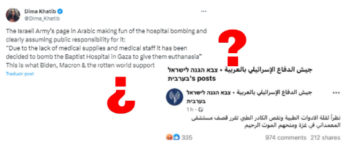 “La página del ejército israelí en árabe burlándose del bombardeo al hospital y asumiendo claramente la responsabilidad pública por ello”. Con este mensaje, la periodista de Al Jazeera Dima Khatib comparte la captura de una publicación de, supuestamente, la cuenta de Facebook del ejército israelí en árabe.