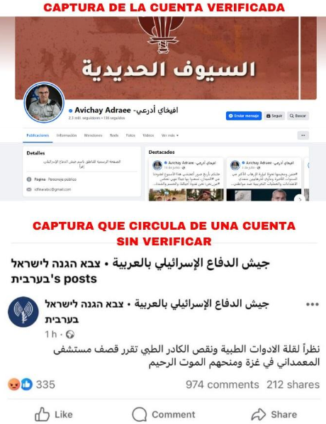 La cuenta que lo ha publicado, ahora eliminada, no tenía el tick azul de verificación de Facebook. Si nos vamos a la cuenta de X (anteriormente Twitter) de las Fuerzas de Defensa de Israel (FDI), vemos que ofrecen un listado de perfiles en los distintos idiomas en los que publican. La cuenta en árabe es la de Avichay Adraee, jefe de la división de medios árabes de la Unidad de Portavoces de las FDI. Su cuenta de Facebook, a diferencia de la que está circulando, sí está verificada.