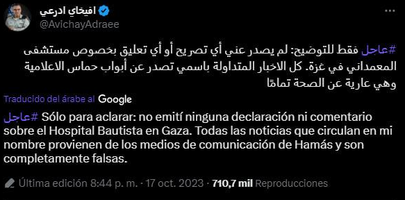 En su cuenta de X (antes Twitter), Adraee afirmó que él no emitió “ninguna declaración ni comentario sobre el Hospital Bautista en Gaza”.