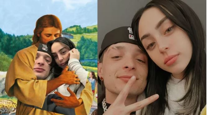 La primera es una edición que muestra a la pareja muy juntos siendo abrazados por Jesús. Mientras que en la segunda imagen fotográfica ambos sonríen muy enamorados.