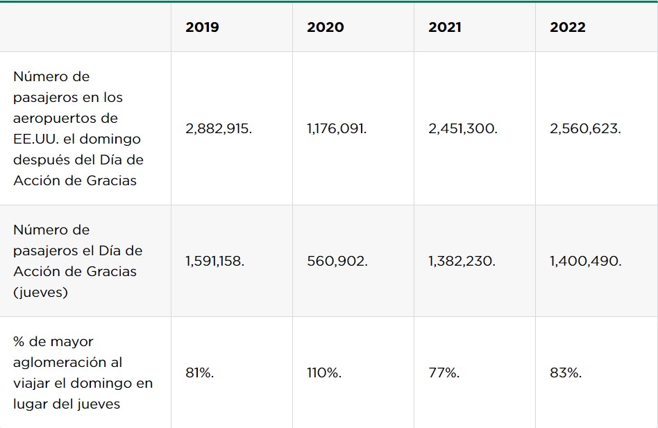En cada uno de los últimos cuatro años, el domingo después de Acción de Gracias fue el día más concurrido para viajar de los siete días anteriores y posteriores a Acción de Gracias.