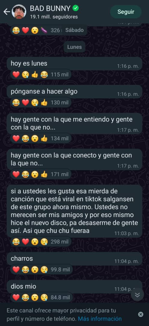 “Ustedes no merecen ser mis a amigos”, es una parte de las palabras que escribió en su canal en WhatsApp el artista. Y fue tanto el enojo de Bad Bunny que ocultó todos sus videos en TikTok.