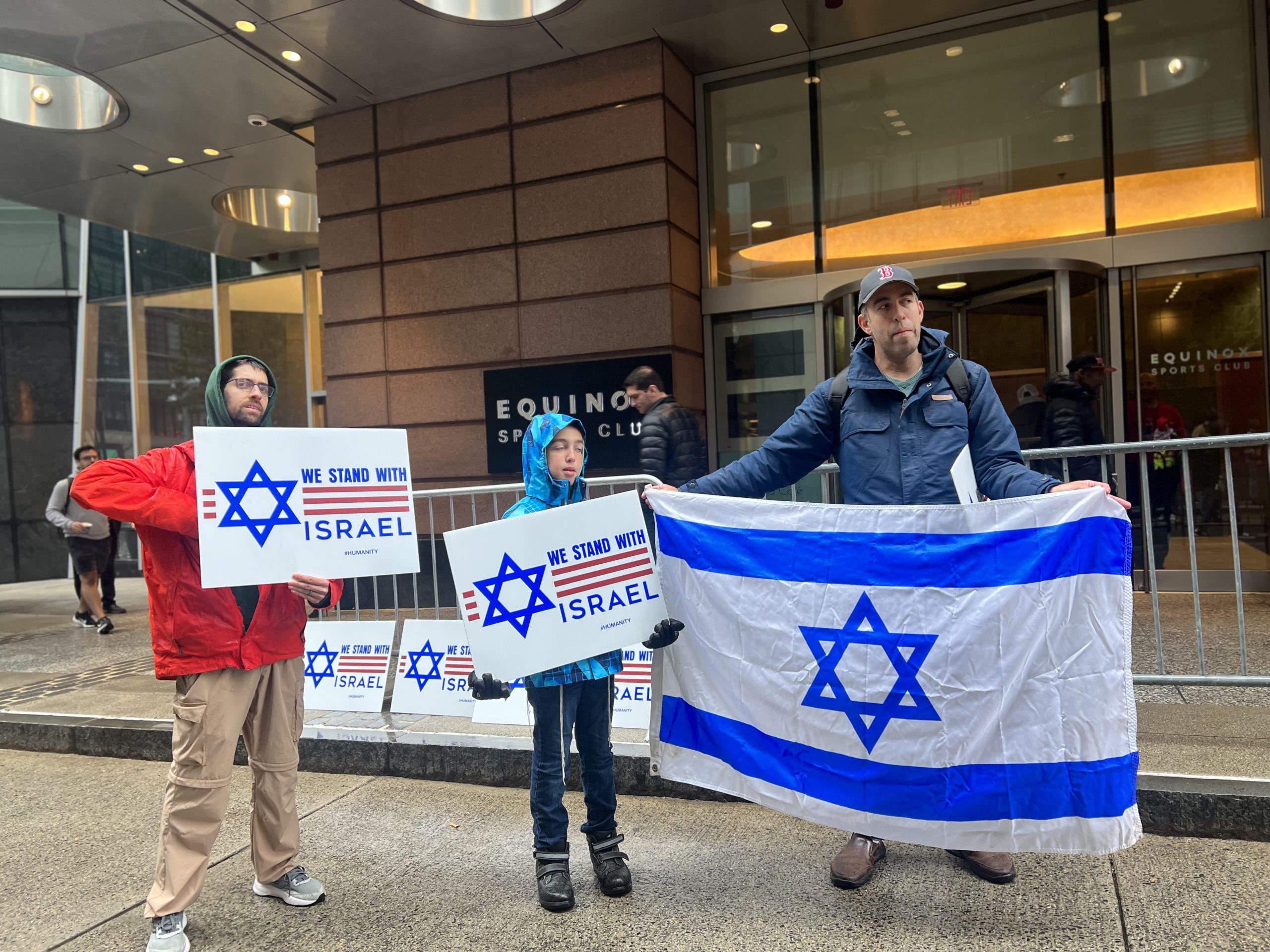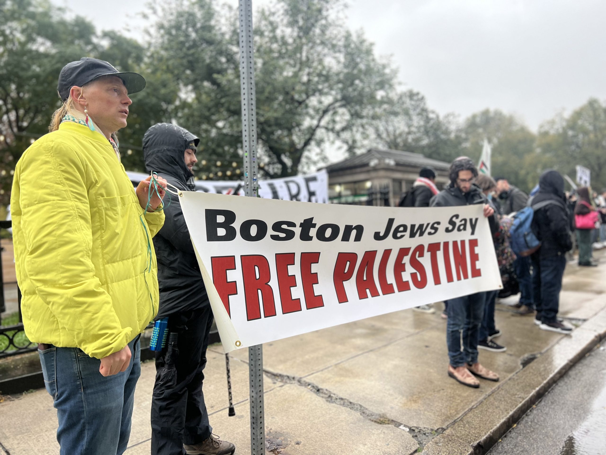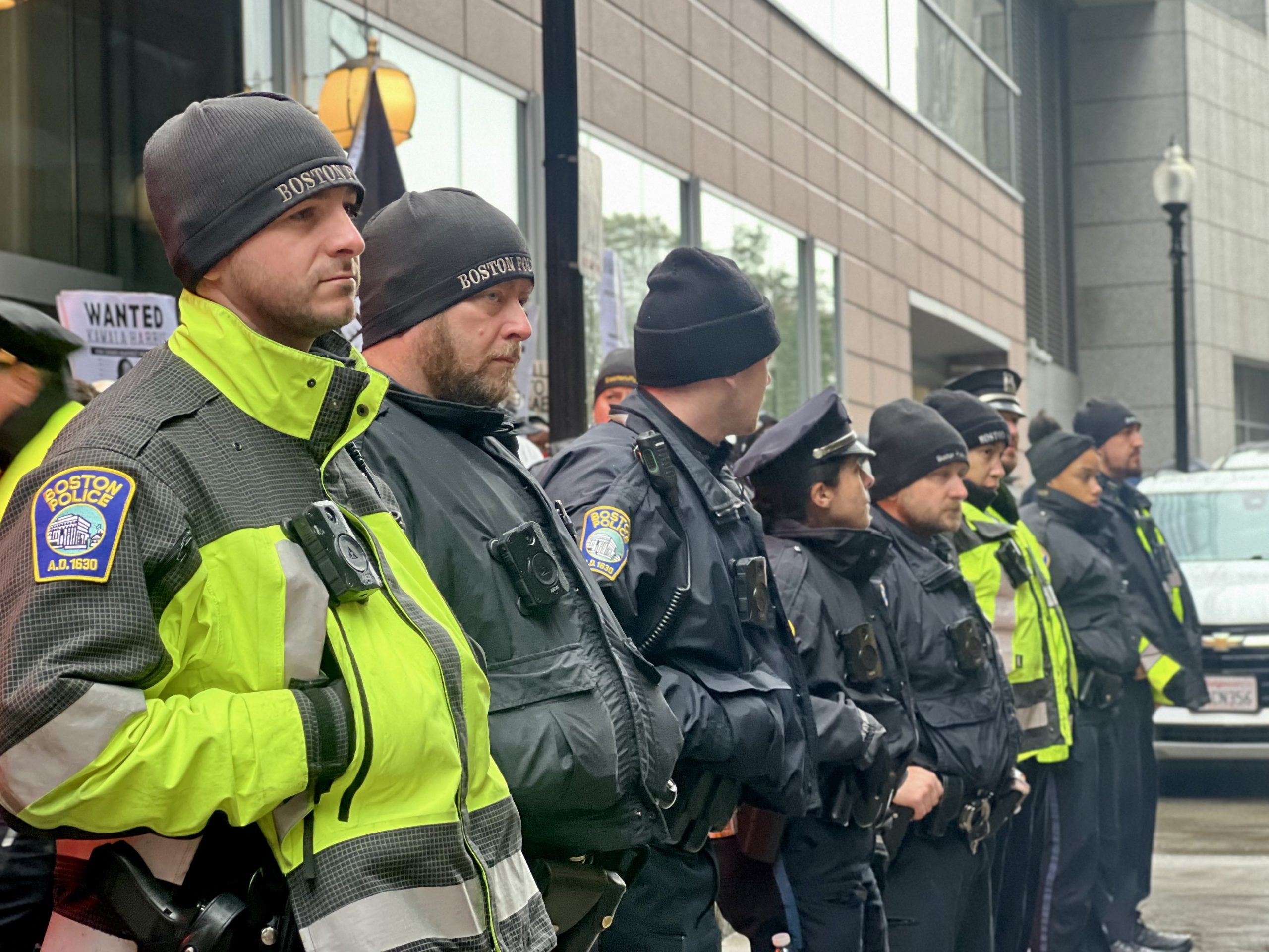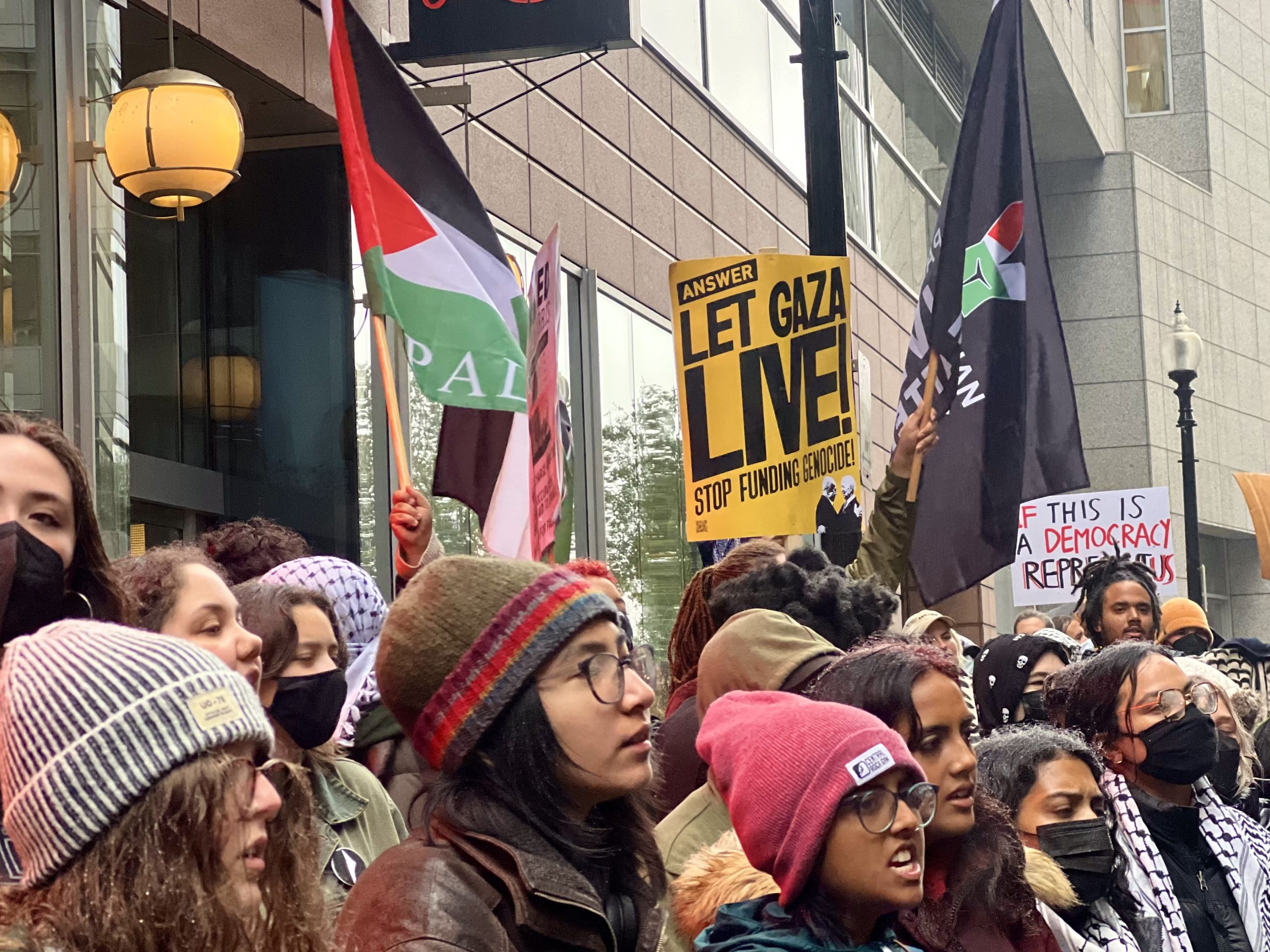 La llegada de la vicepresidenta a Boston reunió a protestantes en el hotel The Ritz- Carlton sosteniendo pancartas y banderas apoyando a los palestinos, a los israelíes y a ambos.