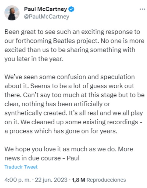 Después del primer anuncio de Paul McCartney, algunos contenidos aseguraron que se utilizó la inteligencia artificial para clonar la voz de John Lennon. En un tuit publicado el 22 de junio de 2023, el músico detalló que ha habido “cierta confusión y especulación” en torno a sus palabras, y que se difundieron “muchas conjeturas”. “No puedo decir demasiado en esta etapa, pero para ser claros, nada ha sido creado artificial o sintéticamente. Todo es real y todos tocamos en ello. Hemos limpiado unas grabaciones ya existentes, un proceso que ha durado años”, incidió el cantante.