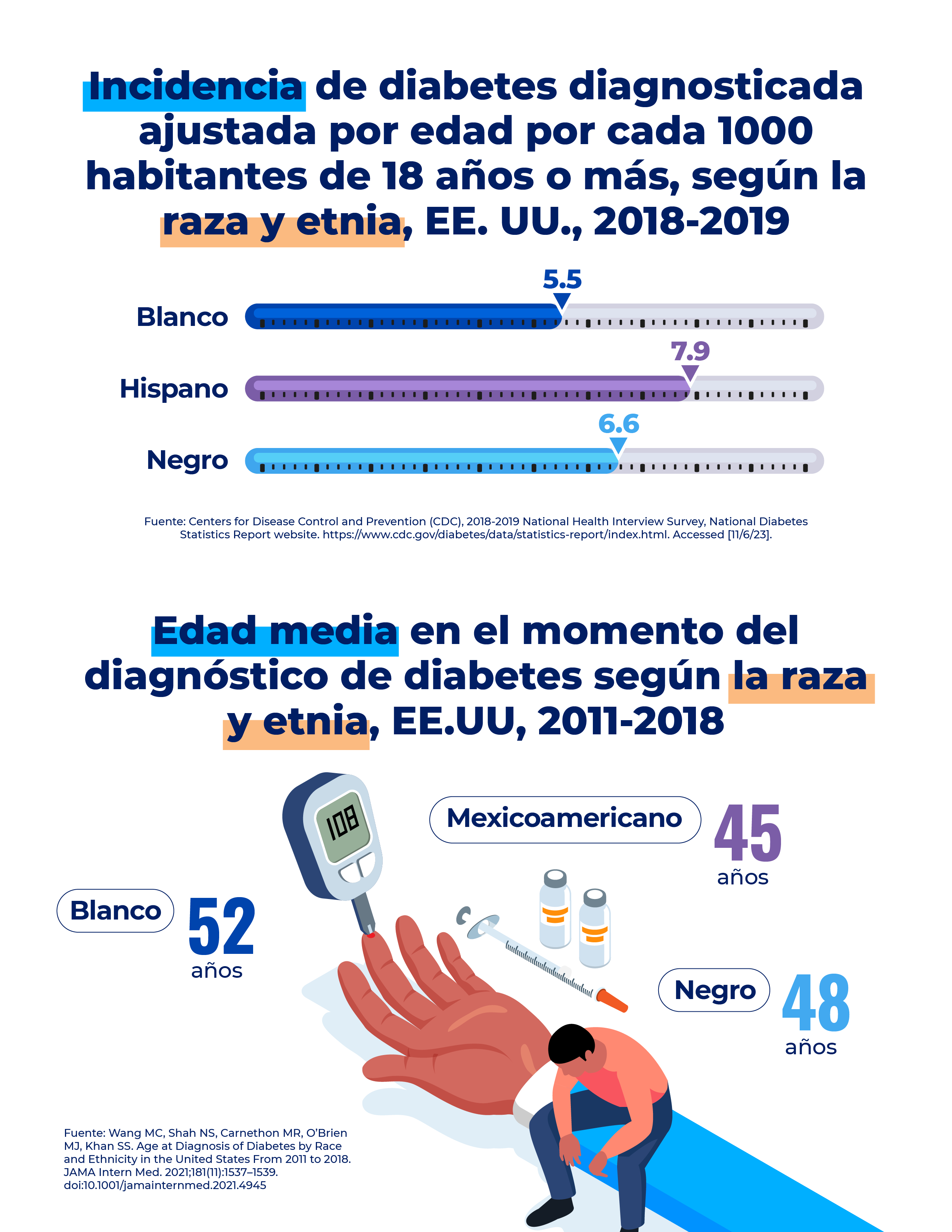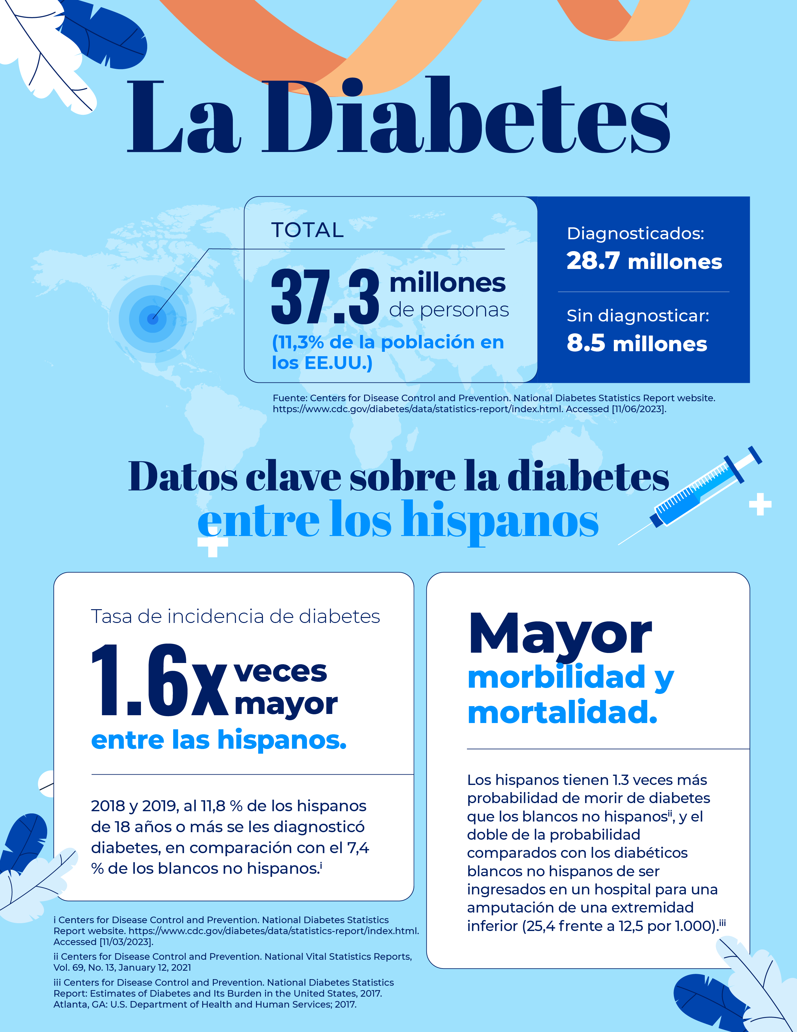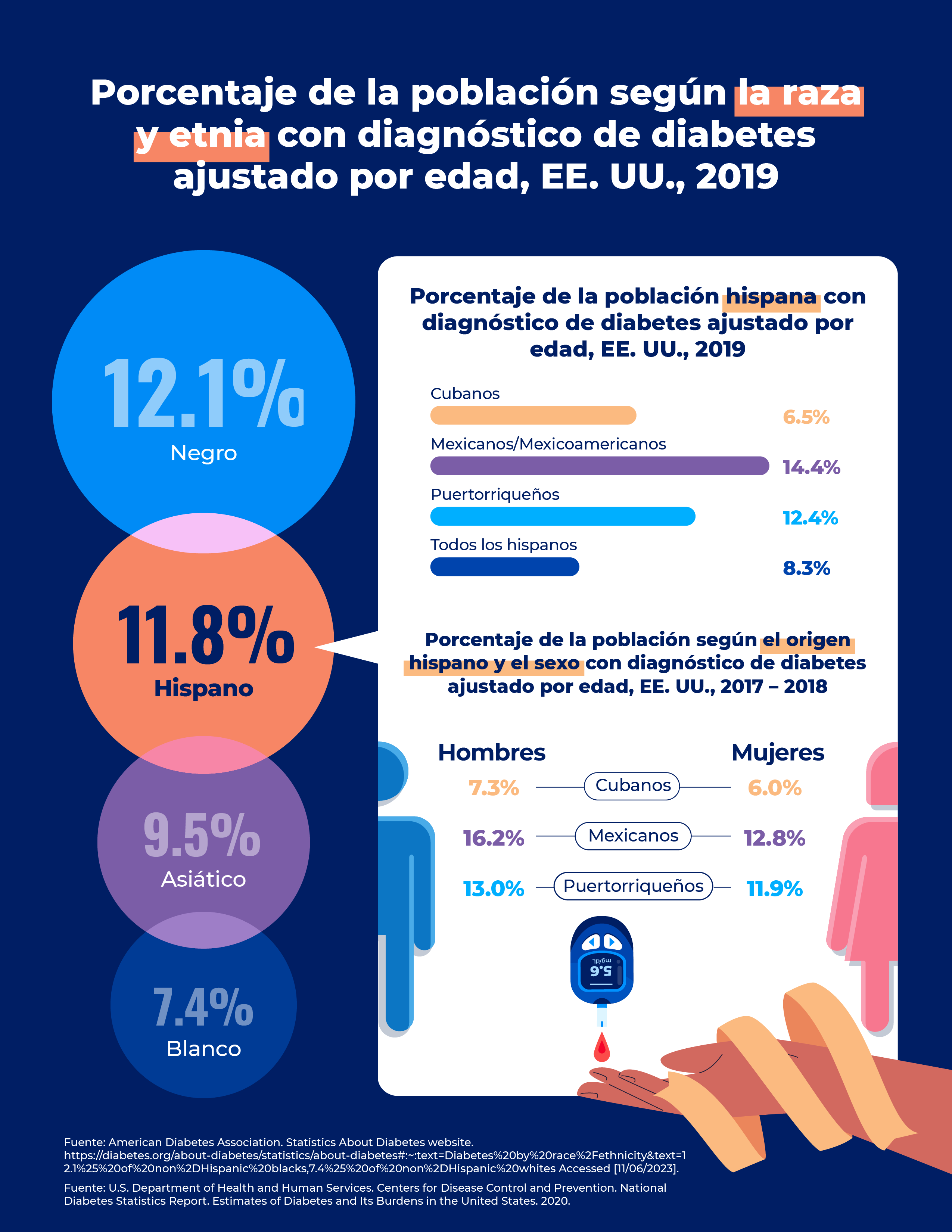 Esta infografía destaca no solo las diferencias en la incidencia de la diabetes entre hispanos y no hispanos, sino también las consecuencias de salud más graves que enfrenta la comunidad hispana, incluyendo una mayor morbimortalidad.