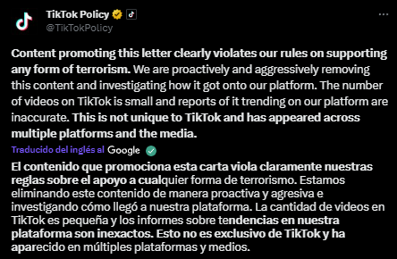 “Los contenidos que difunden esta carta violan nuestras normas en contra del enaltecimiento de cualquier clase de terrorismo”. La agencia de noticias Reuters recoge esta comunicación oficial de TikTok, que la propia red social había difundido en su cuenta oficial de X (antes Twitter).