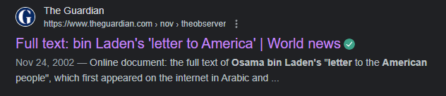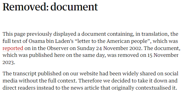 El manifiesto de bin Laden se publicó originalmente en The Observer, un dominical británico propiedad de The Guardian. Aquello fue el 24 de noviembre de 2002, y el texto se mantenía público desde entonces en, precisamente, la web de The Guardian. Sin embargo, ya no es posible leerla así.
