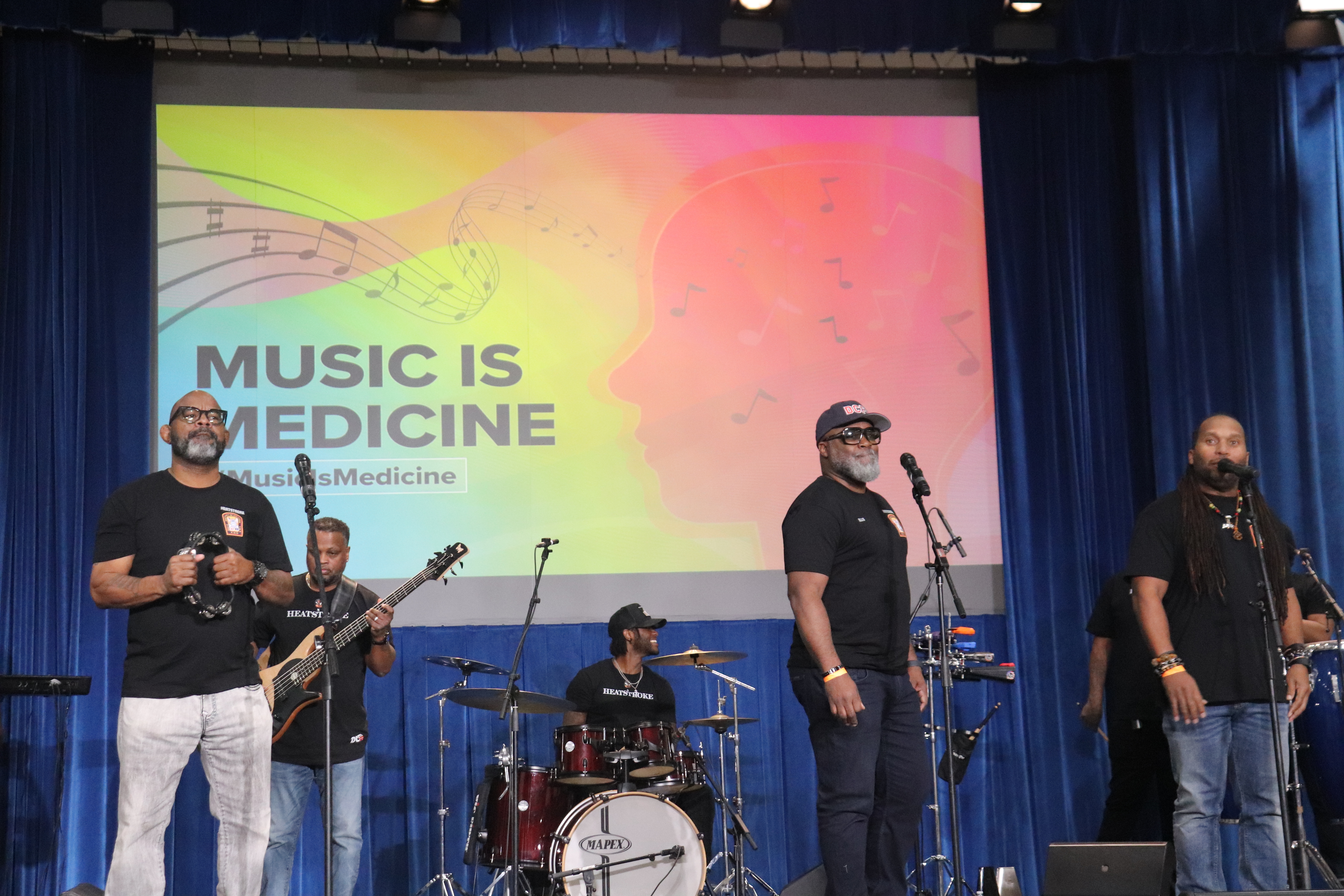 El evento concluyó con la banda HeatStroke, una banda go-go de DC formada por bomberos y paramédicos que comenzaron a tocar durante la pandemia para ayudarse unos a otros y abordar la salud mental con el poder curativo de la música.