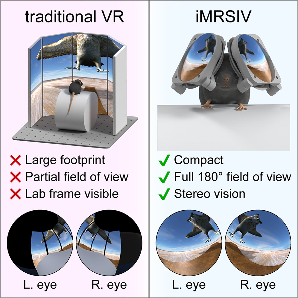 Los métodos anteriores que utilizaban pantallas planas para rodear a los ratones se quedaban cortos, ya que carecían de una profundidad 3D realista y no podían ocultar la vista del laboratorio.